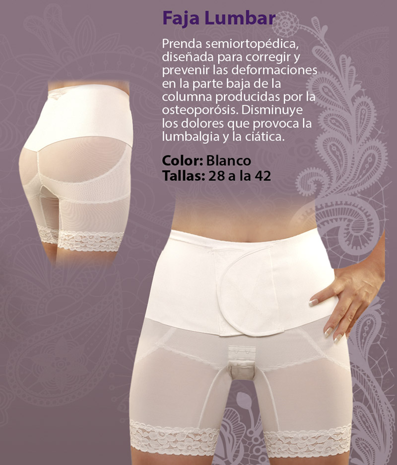 Prenda diseñada para corregir la postura, protege la espalda y rectifica la columna, ya que la mantine en posición correcta. Ayuda a aquellos caballeros que tienen principios de lumbalgia, ciática y osteoporosis. Las bandas protegen las vertebras lumbares ejerciendo presión, evitando asi dolores en esta área. Color: Blanco Tallas: 28 a la 42 y tallas especiales**