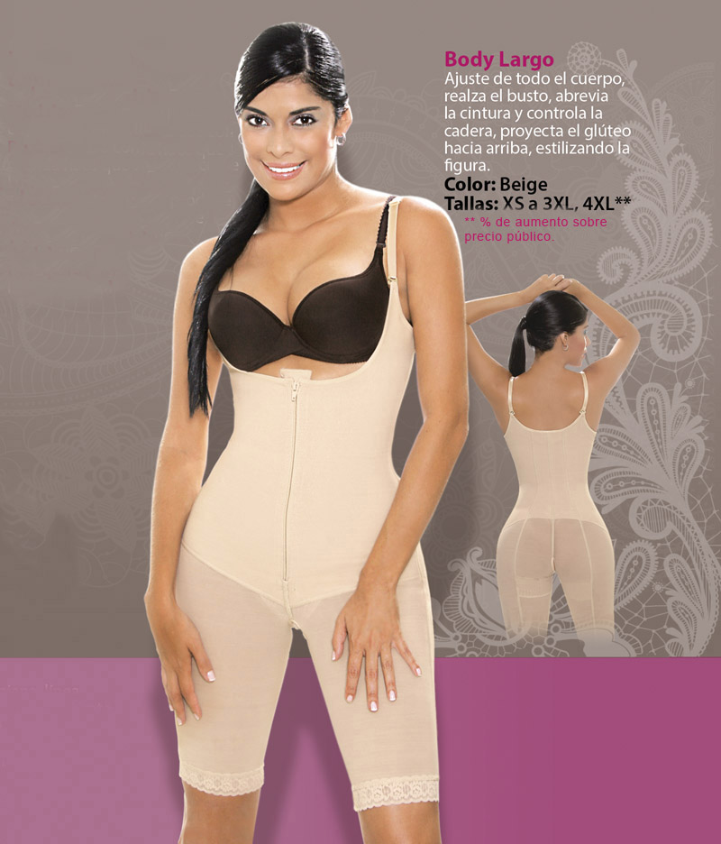 Su diseño proporciona un ajuste y soporte integral al cuerpo, manteniendo los hombres hacia atrás y proyectando el pecho hacia enfrente. Descarga los hombros del peso de los senos y mejora la postura, cuenta con un panel frontal que comprime el abdomen y el vientre bajo. Realza los glúteos y acentúa la cadera, ya que es un producto diseñado para mujeres con piernas delgadas y de poca cadera, al igual que el body largo, estiliza la figura. Color: Beige y Negro Tallas: 28 a la 42 y tallas especiales **